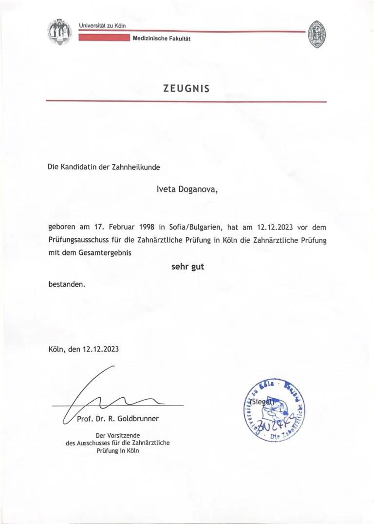Диплома за завършено с отличие висше образование по "Дентална медицина" от медицинския факултет на Университета в Кьолн